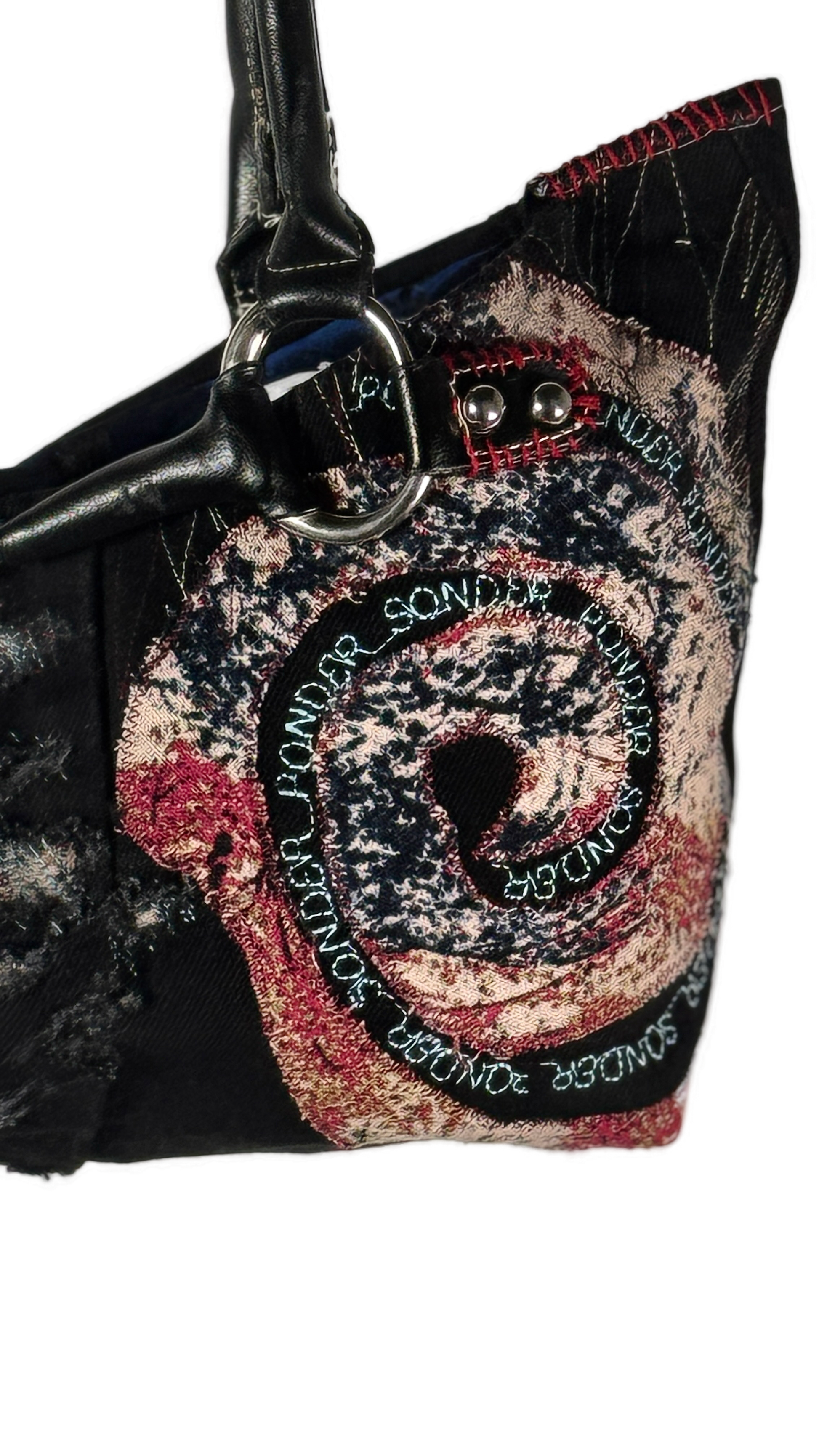 Distressed denim, stitched in stars, embroidered writing in a spiral " Ponder Sonder".